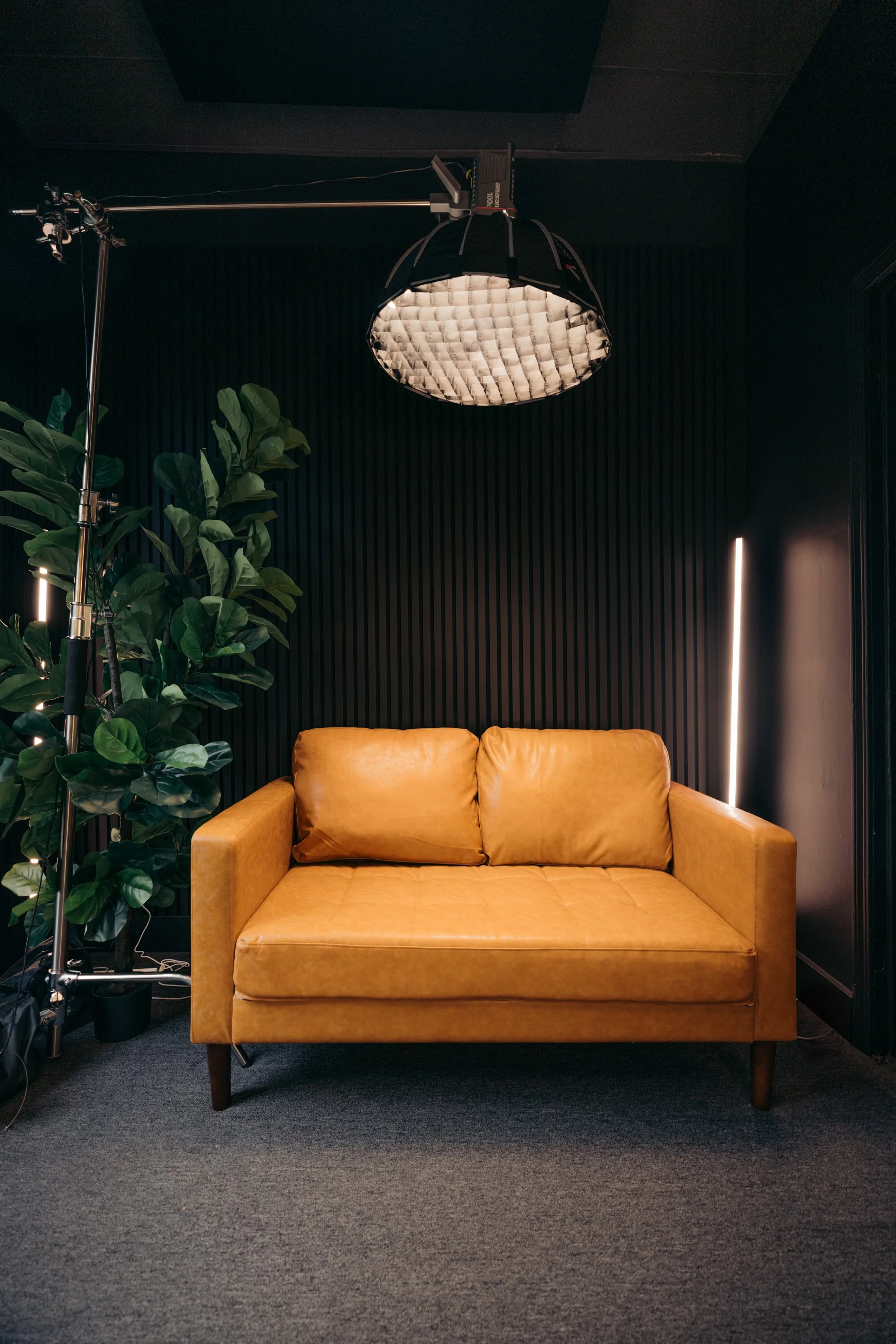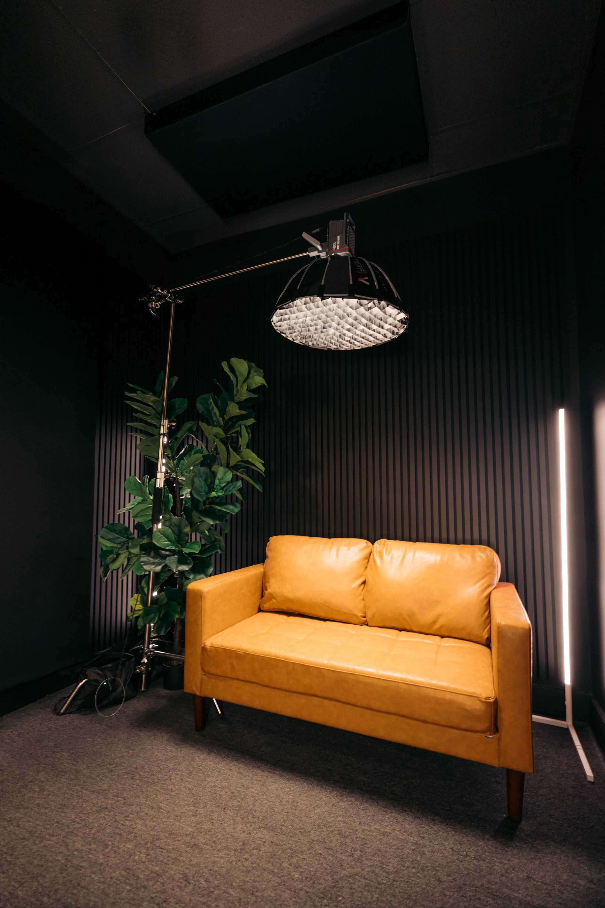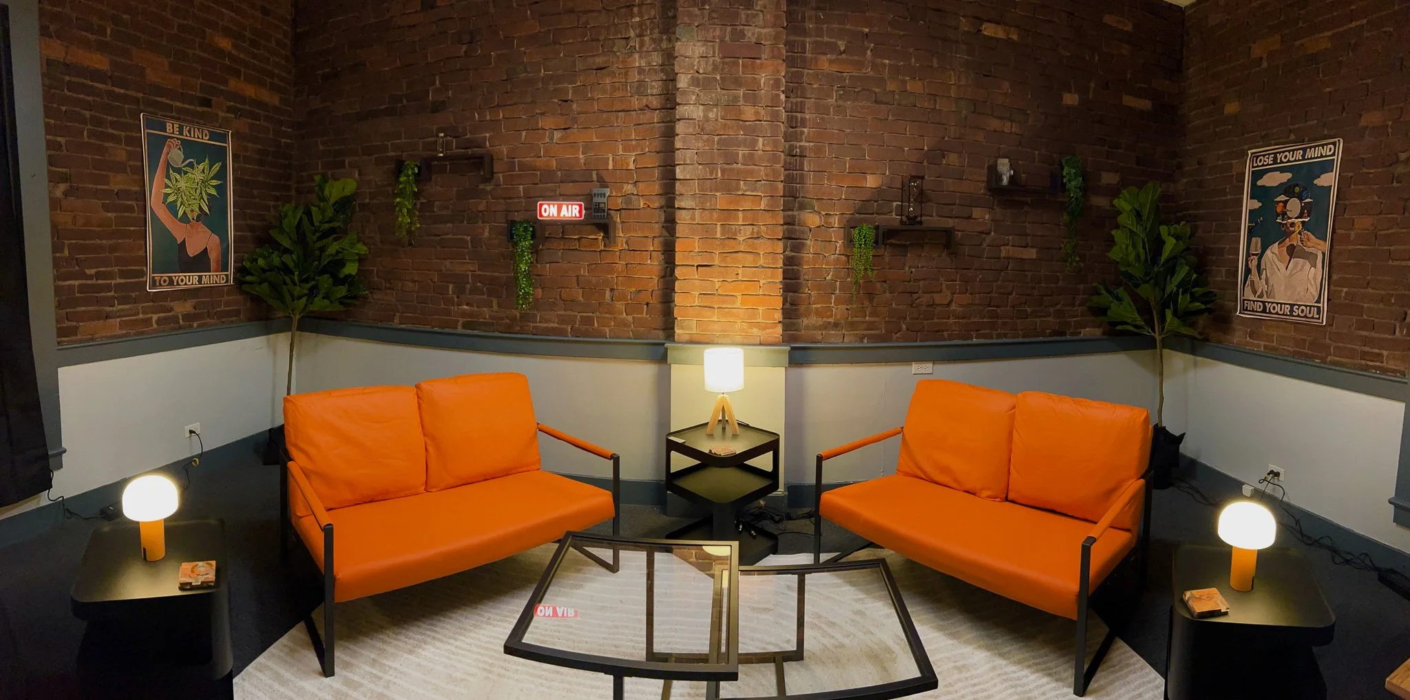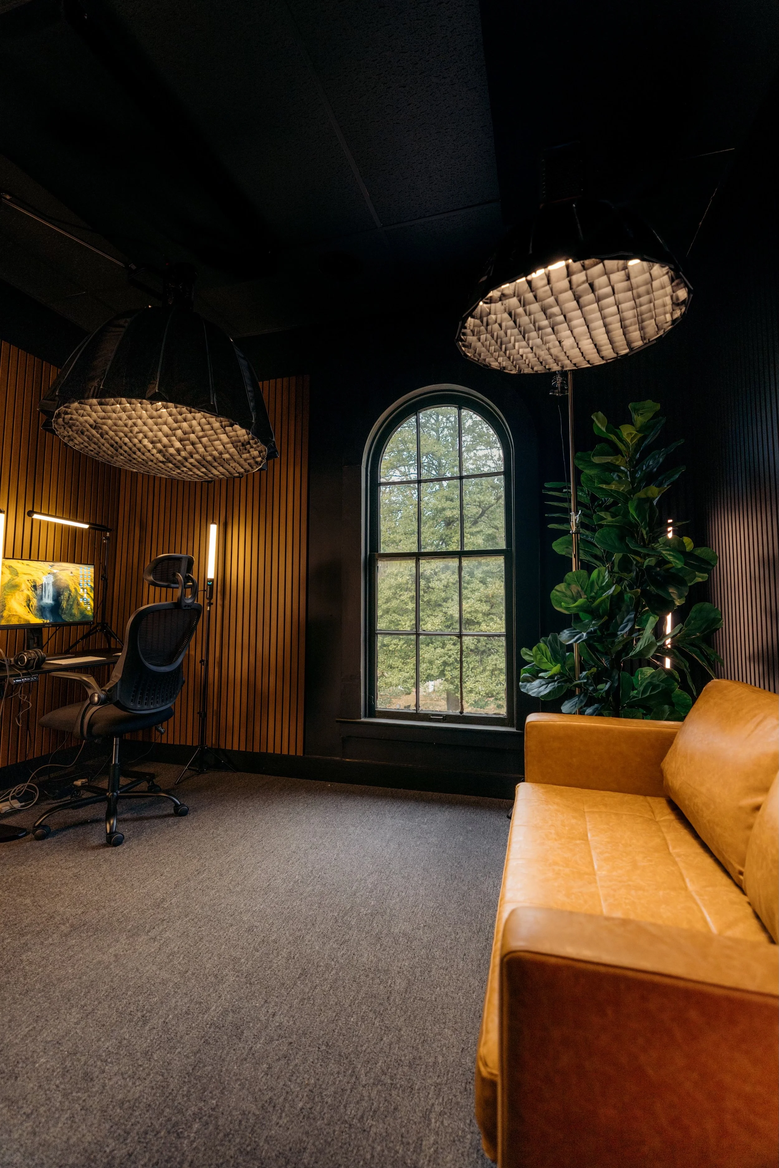 Content Creation Haven Upstairs: Step into the Filmhaus Room, a versatile, modular content creation space designed to inspire creativity. With warm wood panel walls, a sleek desk complete with a monitor, and a cozy couch adorned with greenery, this room is as aesthetically pleasing as it is functional. Perfect for content creators, it’s equipped with professional-grade video lighting, allowing you to simply flip a switch and start filming. Whether you're recording with a phone or a camera, this space provides a seamless, ready-to-use setup for capturing high-quality content.